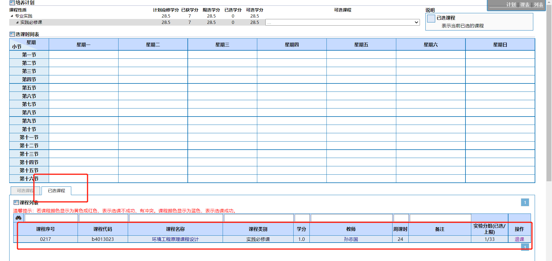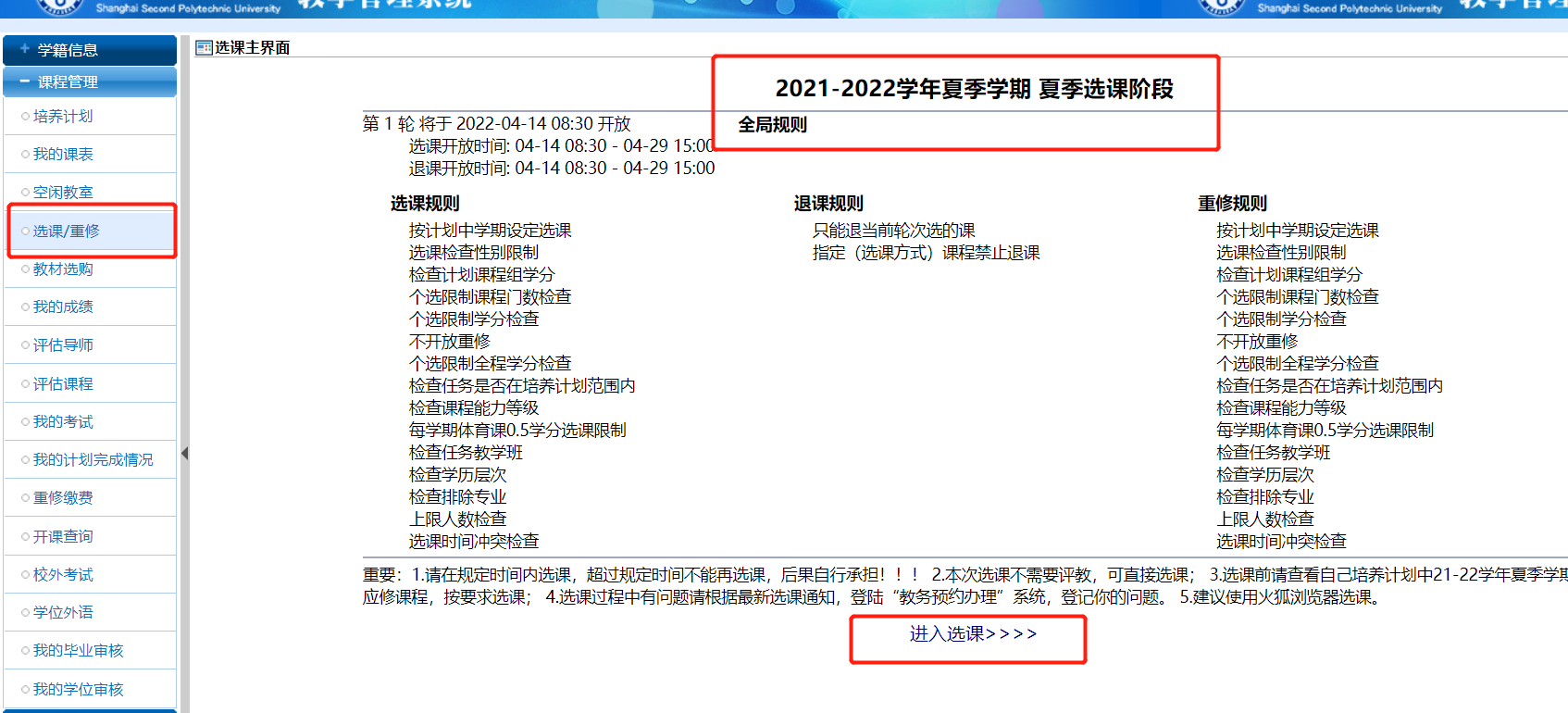 1、登录后点击左侧的“课程管理”下的“选课/重修”按钮进入选课主界面,请仔细阅读选课规则;