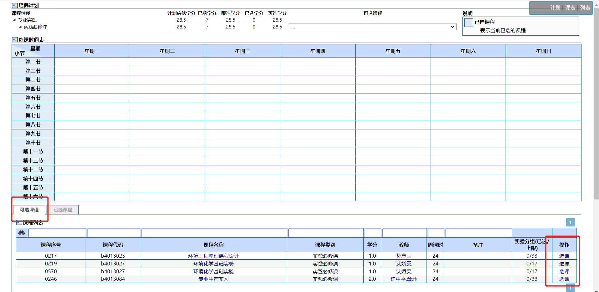3、在“课程性质”下选择相应的课程类别,点击右侧可选课程下拉列表,选择课程名称,在界面下部会出现“可选课程”,进行课程选择;