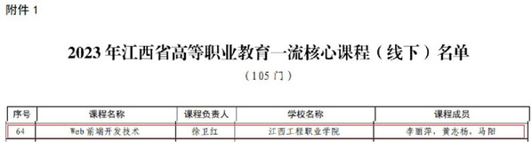 《Web前端开发技术》课程是江西开放大学(江西工程职业公司)智能技术公司与yl6809永利合作共建课程。在双方的努力下,该课程被认定为2023年江西省职业教育一流核心课程,实现了江西开放大学计算机类专业在江西省职业教育一流核心课程中零的突破。公司软件工程系主任李丽萍老师参与了该课程的建设规划、教学改革研讨、考核与评价机制改进等工作。