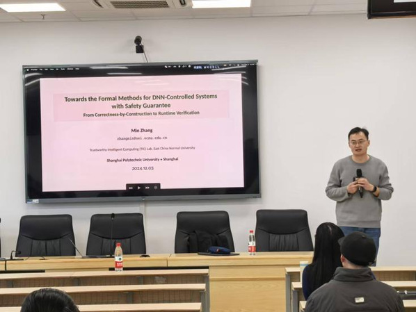 张民教授围绕“面向高可靠智能控制系统的形式化方法研究”进行了深入讲解,分享了团队在CAV、NeurIPS等国际顶级会议上的研究成果,探讨了形式化方法在提升智能控制系统安全性和可靠性方面的应用。