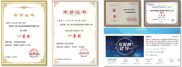 教师获全国及上海市高校教师教学创新大赛多个奖项,其中,龚玉梅教师团队、杨洁教师团队分别获2022年第二届、2023 第三届上海市高校教师教学创新大赛一等奖,获国家教学成果奖二等奖、上海市教学成果奖一等奖、二等奖,中国国际工业博览会高校展区优秀展品一等奖等奖项。